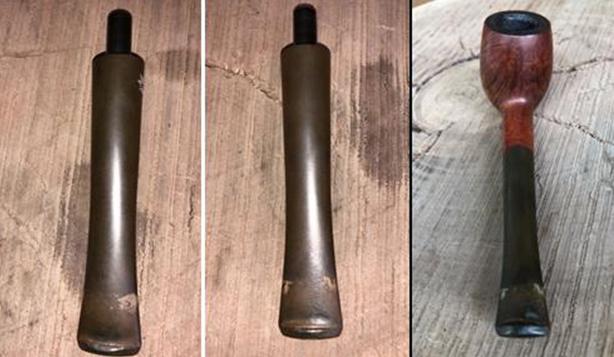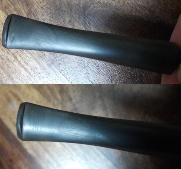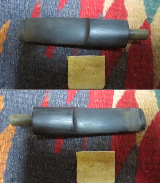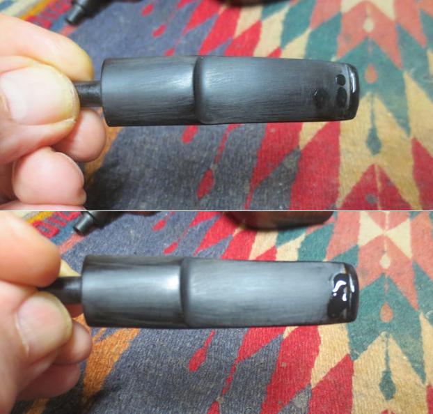 The stem looked dirty and oxidized with the calcification left behind by a pipe Softee bit. The edges of the button had bite marks and there was some tooth damage to the surface of the stem next to the button on both sides.