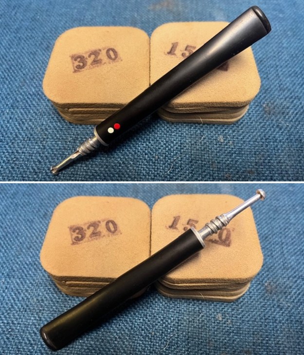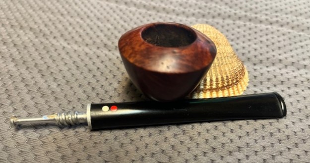 I took a picture of the stamping on the shank sides and it was all clear and readable as noted above. I took the pipe apart and took a photo of the pipe with the stem. It is a good looking pipe and very unique. The stinger apparatus and integrated tenon were a single unit.
