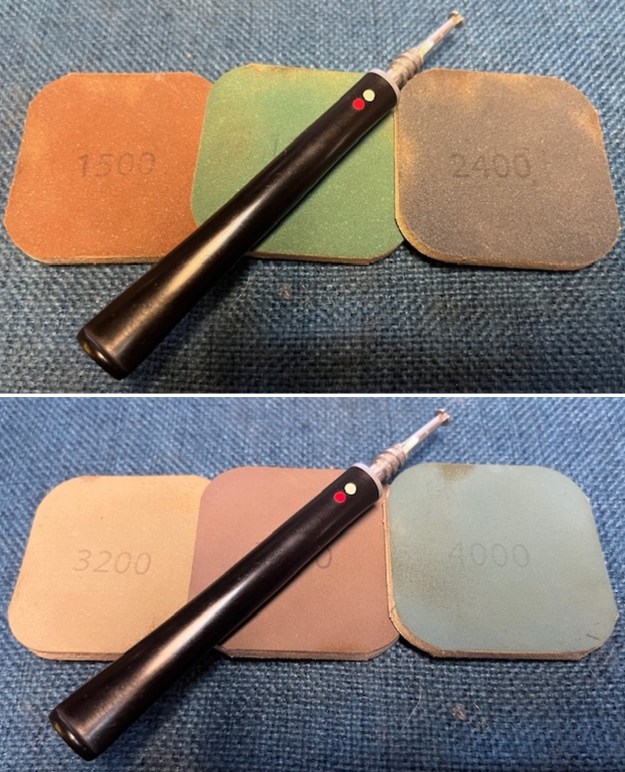 I sanded the nicks and scratches in the rim cap and bowl with 320-3500 grit sanding pads. I wiped the bowl down between sanding pads with a damp cloth. By the last pad the pipe began to take on a shine.