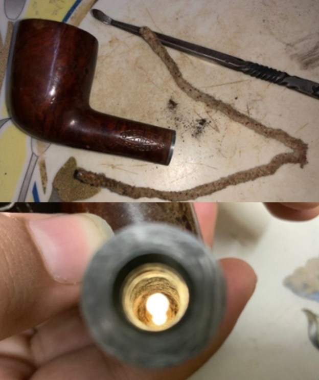 With the stem refurbishing nearly completed, save for final polish using Blue Diamond and wax, I move to clean the exterior of the stummel. I used a hard bristled tooth brush, Scotch Brit pad and Murphy’s Oil soap to scrub the stummel and rim top. I shall be candid in confessing that I was extra aggressive using the Scotch Brit pad as I was keen to completely remove the peeling lacquer coating over the stummel surface. After the scrub with oil soap, I washed the stummel under running warm water with anti oil dish washing detergent till the stummel surface was clean and dried it using paper towels and soft cotton cloth. I once again cleaned the shank internals with the detergent and hard bristled shank brush and set the stummel aside to dry out naturally. The two fills have gone soft and would need to be refreshed. The stummel has cleaned up nicely with the old lacquer coat completely removed from the surface. The ghost smells are completely eliminated and the pipe now smells fresh, odorless and clean. The shank air way is nice and open. I shall refresh the fills over the stummel surface with a mix of briar dust and superglue.