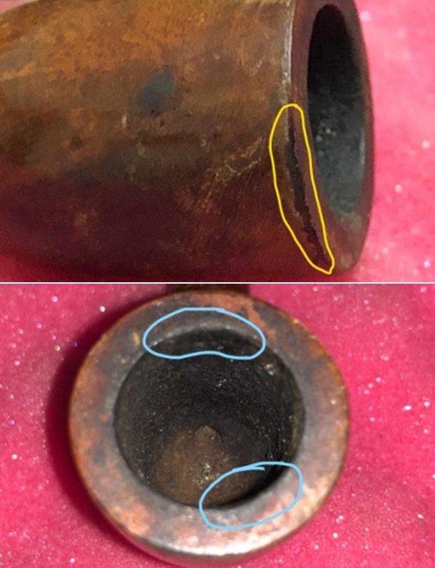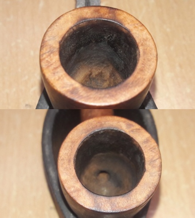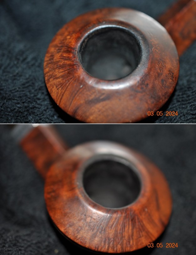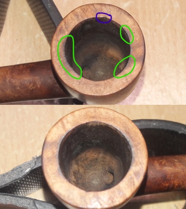 This pipe has a rather small bowl in a classic Dublin shape and has a chamber depth of about 1.1 inches. The chamber had an even layer of dry flaky cake which is not very thick. The condition of the inner walls of the chamber can be commented upon after the cake has been taken down to the bare briar. The rim top surface was covered in overflowing lava. The inner rim edge has minor charring in 6 o’clock and 11 o’clock directions (encircled in pastel blue) with some minor dings all along the edge. The outer rim edge is mysteriously darkened in the 12 o’clock direction. The draught hole is clogged and restricts the free flow of air through it. The ghost smells in the chamber are very mild.