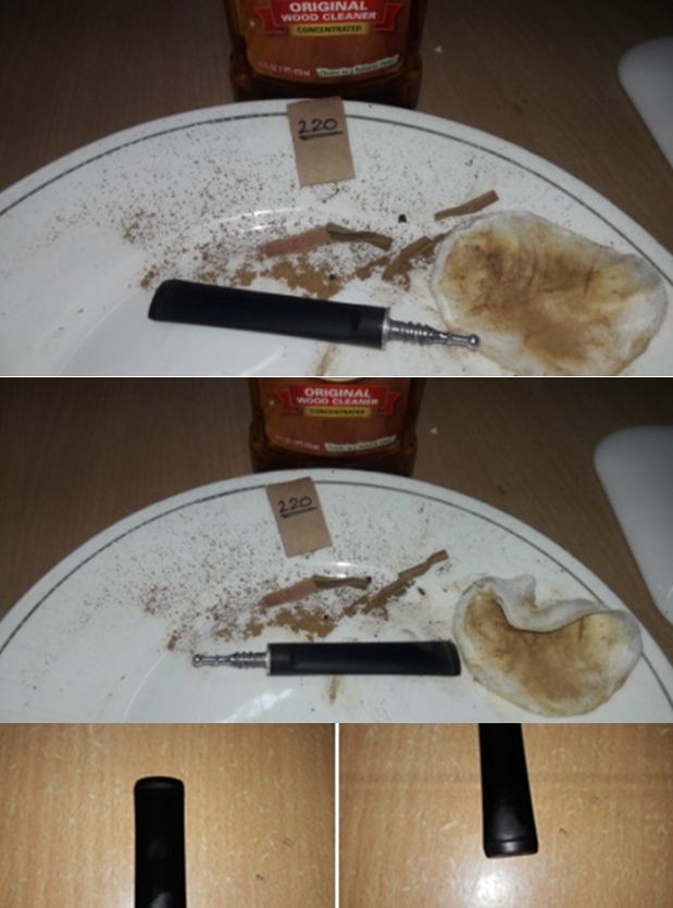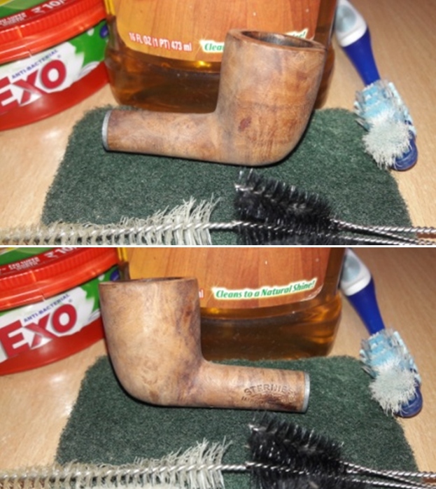 Abha, my wife, reamed out the complete cake and further smoothed out the chamber walls with a folded piece of 220 grit sand paper and scrapped out the entire lava overflow from over the rim top surface. She further cleaned out the internals of the shank with pipe cleaners and alcohol and cotton buds. She followed the internal cleaning of the shank with external cleaning of the stummel using Murphy’s Oil soap and hard bristled tooth brush and dried it with paper napkins and cotton cloth. Next she cleaned out the internals of the stem air way using hard and regular pipe cleaners dipped in isopropyl alcohol. She cleaned the stem surface under running warm water and scrubbed the surface oxidation from the stem using Scotch Brite pad and dish washing soap. The aluminum stinger was also similarly cleaned. She further removed the oxidation by scrubbing the stem with 0000 grade steel wool and applied a little olive oil to rehydrate the stem.    Once The Pipe Is On My Work Table…
