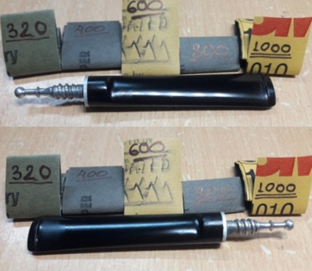 I further sand the stem surface with 320 followed by 400, 600 and 800 grit sandpapers. I finished the sandpaper cycle by wet sanding the entire stem surface with a piece of 1000 grit sandpaper. I wiped the stem with a moist cloth to remove the sanding dust and applied a small quantity of EVO to hydrate the stem.