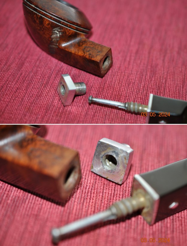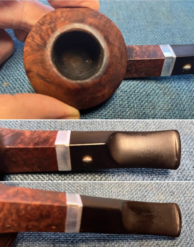 To be honest, the pipe had cleaned up nicely. What she thought was unclean stummel was in fact the old lacquer coat that had come off in patches. The two fills, encircled in yellow, are now plainly visible. The right side of the stummel shows a few dents/ dings. The aluminum spacer ring at the shank end is greatly oxidized and would need to be polished to a nice shine. The mortise is nice and clean. Sanding the stummel surface with a piece of 220 grit sand paper should address the issue of dings to a great extent. Once the stummel has been completely scrubbed and free of the old lacquer, I shall refresh the fills with a mix of briar dust and superglue. A vigorous scrub with Scotch Brit pad and Murphy’s Oil soap should suffice to remove the old peeling lacquer coat. In case this does not work, a wipe with pure Acetone on a cotton swab will definitely address this issue. After the aluminum spacer ring has been polished, it will provide a nice bling to the overall appearance of the pipe.