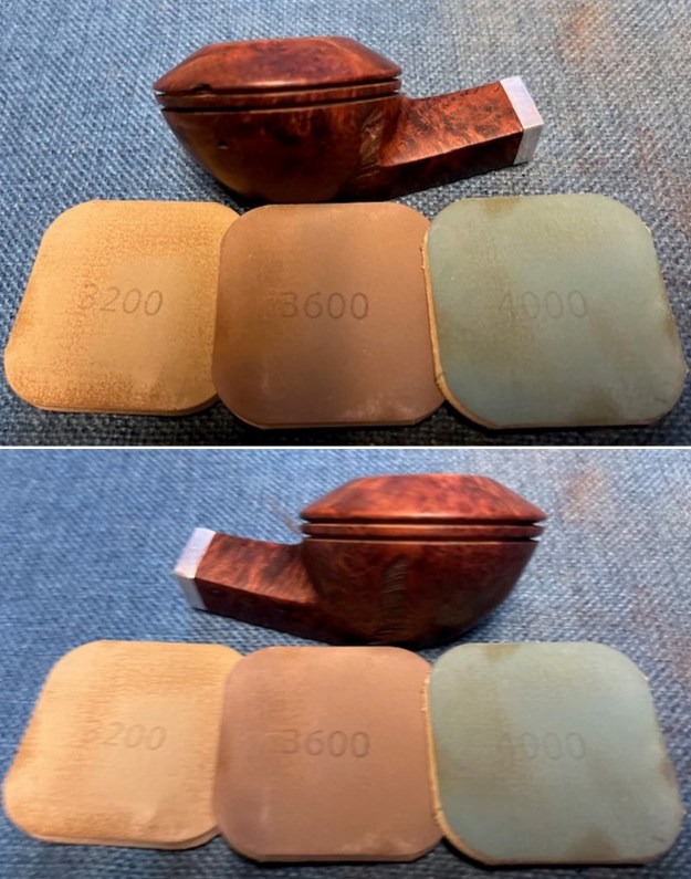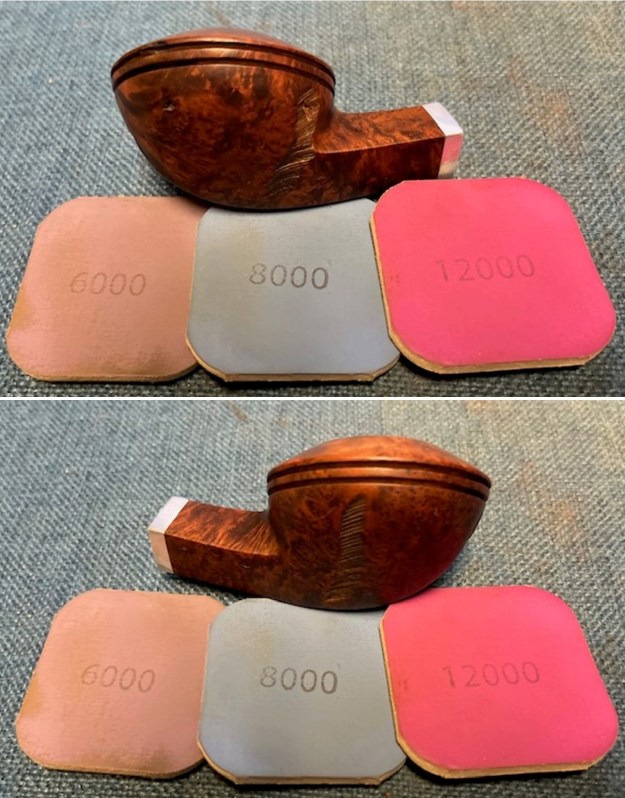 To complete the restoration, I mount a cotton cloth buffing wheel on to my hand held rotary tool and applied a coat of Blue Diamond to the stummel and the stem to polish out the minor scratches.