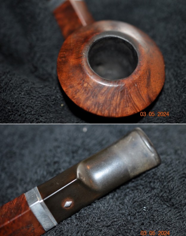 The next pipe on the work table came to us from an online auction from Schulenburg, Texas, USA. It is classic Billiard with mixed grain around the bowl and shank. It is stamped on the left side of the shank and reads Sterncrest [over] LHS in a Diamond [over] Imported Briar. There is a Sterling Silver band on the shank that has the image of a hunting dog (pointer) [over] Sterling on the top side. I have worked on and restored quite a few American made LHS (LH Stern) pipes over the years and quite a few have been Sterncrest. However, this is the first one I have done with the hunting dog etched in the Sterling Silver band. The finish was very dirty with dust and grime ground into the bowl sides and obscuring the grain. There were some putty fills and deep nicks in the finish around the bowl sides. There was a very thick cake in the bowl and lava overflow on the beveled rim top. The silver band was oxidized and dirty. The vulcanite stem was oxidized, calcified and had deep tooth marks and chatter ahead of the button on both sides. Jeff took photos of the pipe to show its general condition before he did his cleanup.  As I mentioned above the exterior of the pipe was very dirty – grime and grit ground in from years of use and sitting. I have to say that this was obviously someone’s favourite pipe judging from the buildup in the bowl. The rim top was covered with a coat of thick lava that overflowed from the extremely thick cake in the bowl. It was hard to know what the rim edges looked like because of the lava.  The stem was dirty and oxidized with tooth chatter and marks on the top and underside of the stem at the button. Jeff took photos of the sides and the heel of the bowl to give a better feel for the condition of the briar around the bowl. The pink fills are visible all around the bowl sides.  The next photos show the stamping on the side of the shank and the etched hunting dog on the band. The stamping is very readable. It reads as noted above. The stamped dog comes through in the tarnished silver in the pictures.  Jeff took a photo of the stem removed from the shank to show the pressure fit stinger in the tenon.Jeff cleaned the pipes with his usual penchant for thoroughness that I really appreciate. The pipe was a real mess when he got it and I did not know what to expect when I unwrapped it from his box. I was surprised to see how well it turned out. He reamed it with a PipNet pipe reamer and cleaned up the reaming with a Savinelli Fitsall Pipe Knife. He scrubbed out the internals with alcohol, pipe cleaners and cotton swabs until the pipe was clean. He scrubbed the exterior of the bowl with Murphy’s Oil Soap and a tooth brush to remove the grime and grit on the briar and the lava on the rim top. The finish looks very good with good looking grain around the bowl and shank. The putty fills had all fallen out on the sides and front of the bowl and left pits.  Jeff scrubbed it with Soft Scrub and soaked it in Before & After Deoxidizer to remove the oxidation on the rubber. When the pipe arrived here in Vancouver for the second stop of its restoration tour it looked a lot better. I took photos before I started my part of the work.  I took some close up photos of the rim top and the stem surface. I wanted to show what cleaned bowl and rim top looked like. The rim top shows some darkening and some damage to the inner edge of the rim on the front. I also took close up photos of the stem to show the tooth chatter and marks on the stem surface.     I took a photo of the stamping on the side of the shank and it is clear and readable. It is stamped as noted above. I removed the stem for the shank and took a photo of the bowl and stem to give a picture of what it looked like. It is a classically shaped Billiard. To me the stinger needs to go!Now, on to my part of the restoration of this Sterncrest Billiard. I decided to clean up the damaged rim top and inner edge of the bowl. I cleaned up the inside of the bowl edges with a folded piece of 220 grit sandpaper. I sanded the darkening on the rim top with a folded piece of 220 grit sandpaper. Once I was finished the top and edge looked a lot better.  I was glad to see that all of the pink putty fills had come out during the cleanup process. I decided to replace them with briar dust and clear super glue. There were actually quite a few of them. I did the repairs to the fills and took photos of the “freckles” around the mid-bowl on the left, front and right sides. Once the repairs cured I sanded them smooth with 220 grit sandpaper. I wiped the bowl down with isopropyl alcohol to remove the debris and the heavier stained areas and even out the coverage on the bowl. I wanted to make the stain more transparent so the grain would show through the finish.   I polished the top of the bowl, the repaired areas and the entirety of the bowl with micromesh sanding pads – wet sanding with 1500-12000 grit pads and wiping the briar down with a damp cloth after each sanding pad.   I rubbed the bowl down with Before & After Restoration Balm. I worked it into the surface of the briar with my fingertips to clean, enliven and protect it. I let the balm sit for 10-15 minutes and then buffed with a cotton cloth to raise the shine.     I set the bowl aside and turned my attention to the stem. I heated the stinger and wiggled it free from the tenon with a pair of pliers. I dropped the stem in Briarville’s Pipe Stem Oxidation Remover to clean up the remaining oxidation. I let it sit in the bath for 2 hours and then removed it and dried it off. I forgot to take a photo of the stem when I removed it from the bath. I dried it off and then filled in the deep tooth marks with black super glue. I set the stem aside to let the repairs cure. Once the repair had cured I used a flat rasp and a file to clean up the button edge and flatten out the repairs. I sanded it with 220 grit sandpaper to further blend the repairs into the vulcanite. I started polish