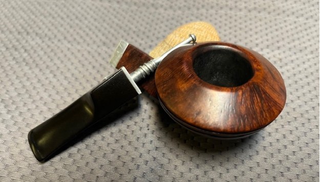The diameter of this pipe is smaller than the normal Stern. Carries the LHS in a diamond logo on the plastic mouthpiece.  The larger of the two L H Stern pipes, identical except for size.    Now it was time to work on the pipe. Given the horrible condition of the pipe shown above I was wondering what it would look like after the cleanup. Jeff did an amazing job on this one. With odd design combining briar, aluminum and plastic it was a lot of detail work to get it clean. The pipe is similar in design Kirstens. He reamed the bowl with a PipNet Reamer and cleaned it up with a Savinelli Fitsall pipe knife. He cleaned out the internals of the shank and airway in the stem with alcohol, cotton swabs and pipe cleaners. He scrubbed the externals of the pipe with undiluted Murphy’s Oil Soap and rinsed with running water. The pipe looked a lot better than when he started. Internally it was spotless and smelled clean. I took some photos of the pipe before I started my work on it.      I took some close up photos of the rim top and the stem surface. I wanted to show the condition of the rim top and edges of the bowl. The outer edges were in okay condition. The inner edges had nick toward the front of the bowl. There was still some peeling varnish on the rim top. There were nicks and gouges in the top of the rim toward the front. I also took close up photos of the stem to show the deep tooth marks and chatter on the top and underside near the button.    I took photos of the stamping on the top of the stem. It is faint but readable. It is stamped as noted above.   I took a photo of the pipe with the stem removed to give and idea of the proportions of the bowl and shank unit and the stem.I took the pipe apart and took photos of the parts.     I decided to start my restoration on this old timer by addressing the varnish or shellac on the bowl by wiping it down with acetone to remove it. Once the finish was gone the briar looked very good.    I moved on to deal with the damage to the inner edge and the rim top. I sanded the inner edge with a folded piece of 220 sandpaper to bring it back into round.  I filled in the flaws on the rim top with clear super glue. I let it cure and sanded them smooth with a folded piece of 220 grit sandpaper.   I topped the bowl on a topping board with 220 grit sandpaper to remove the repair and blend it into the surface of the rim.   I polished the bowl with micromesh sanding pads. I wet sanded with 1500-12000 grit pads and wiped the rim top off after each pad with a damp cloth. The shine began to look very good. I rubbed the bowl down with Before & After Restoration Balm. I worked it into the surface of the rusticated briar with my fingertips and a horsehair shoe brush to clean, enliven and protect it. I let the balm sit for a little while and then buffed with a cotton cloth and shoe brush to raise the shine.      I set the bowl aside and turned my attention to the aluminum shank. I buffed it with Blue Diamond polish on the buffing wheel to raise a shine. I put a Dr. Grabow Charcoal Filter in the shank. The second half of the filter extends into the stem attachment once I have it done.  I screwed the bowl back on to the shank and took photos of what the pipe look like so far. It is looking pretty good at this point in the process. All that is left is the stem to clean up and polish.   Now it was time to work on the stem. There was a chip out of the outer edge of the button. I filled it in with clear super glue. Once the repair cured I sanded it smooth with 220 grit sandpaper and topped the edge on the topping board to flatten out the outer edge of the button.    I sanded the tooth marks and chatter on the stem surface with 220 grit sandpaper to blend them into the surface of the surrounding vulcanite. I started polishing process with 400 grit wet dry sandpaper.        I used some Rub’n Buff Antique Gold to touch up the LHS Diamond on the top of the stem. I polished the stem with micromesh sanding pads – 1500-12000 grit pads. I wiped it down with a damp cloth after each sanding pad. This restored LHS (LH Stern) Filtrex Air Cooled Filter pipe turned out to be a good looking pipe (I think I can call this oddity good looking). The unique set up of the pipe is still a part of the hunt for the dry, cool smoke. That is what makes it interesting to me. The contrasting brown stains on the bowl worked really well with the polished aluminum shank and polished yellow plastic stem. I put the stem back on the bowl and carefully buffed the pipe without the stem with Blue Diamond on the buffing wheel. I gave the bowl multiple coats of Carnauba Wax. I gave the stem multiple coats of Conservator’s Wax. I followed that by buffing the entire pipe with a clean buffing pad. I hand buffed the pipe with a microfiber cloth to deepen the shine. The finished LHS Filtrex Air Cooled Filter Pipe sits well in the hand and feels great. Give the finished pipe a look in the photos below. The dimensions of the pipe are Length: 5 ½ inches, Height: 1 ¾ inches, Outside diameter of the bowl: 1 ¼ inches, Chamber diameter: ¾ of an inch. This unique piece of American pipe history will be joining my collection of oddities that all were a part of the search for the perfect smoke. Thanks for reading this blog and my reflections on the pipe while I worked on it.