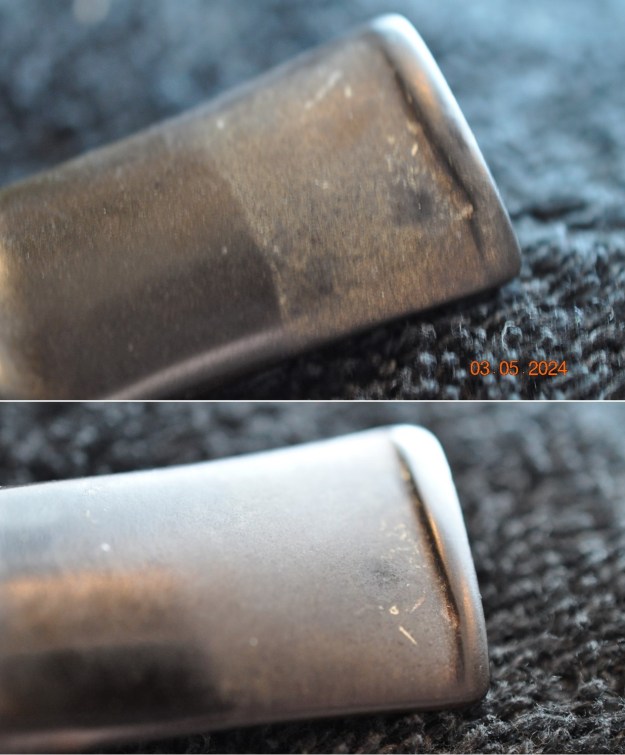 Next she cleaned out the internals of the stem air way using hard and regular pipe cleaners dipped in isopropyl alcohol. She cleaned the stem surface under running warm water and scrubbed the surface oxidation from the stem using Scotch Brite pad and dish washing soap. The aluminum stinger was also similarly cleaned. She further removed the oxidation by scrubbing the stem with 0000 grade steel wool and applied a little olive oil to rehydrate the stem.
