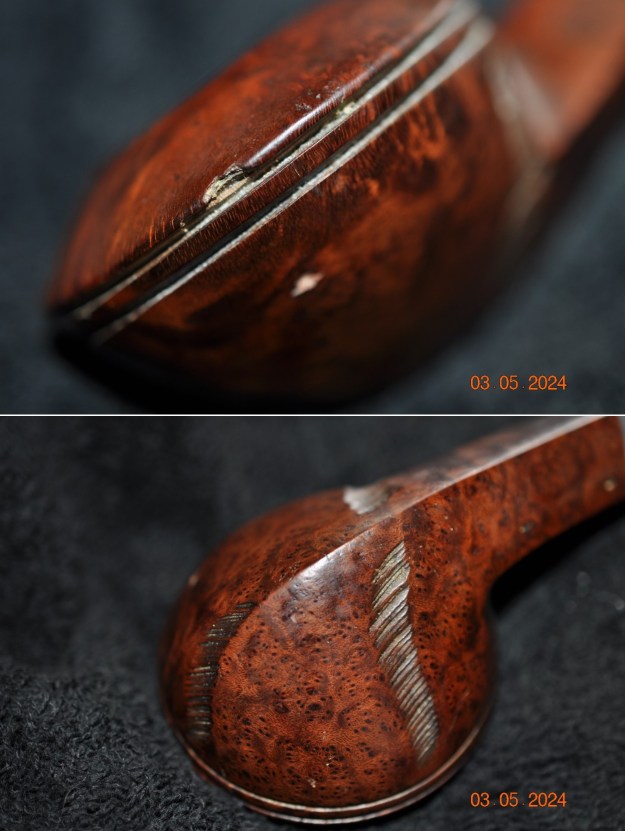 https://www.google.com/patents/US2532820https://www.google.com/patents/US2595534https://www.google.si/patents/US1938874The first picture below shows the end cap removed and the knurled cap pulled out as well. There is what appears to be a spongy end sticking out of the back of the contraption. The knurled end seems like it has a flint or some such end sticking out of the end of the tube. The side plate looks rough and could be a striker. The concept seems pretty straightforward – a single unit that contains the fluid, flint, wick and the striker on the base of a briar pipe. The pipe man simple fills the reservoir wool with lighter fluid. He sticks the striker/wick in the unit at the bottom of the bowl and when he wants to light his pipe he pulls out the striker/wick. He strikes it on the coarse bar on the right side of the unit.My brother took some photos of the pipe when it arrived in Idaho. You can see the flaking and speckled finish of the varnish on the pipe. The aluminum is oxidized and dirty. The stem is oxidized. Later photos will show that it is missing a large chunk on either the top or the underside of the stem at the button. The next photo shows the contraption on the bottom of the bowl and how it is fitted into a slot on the bottom.The next two photos show the pipe from the front end. You can see the striker/flint on the end of the knurled tube. The second photo shows the rim top.The next two photos show the condition of the stem. It had a lot of tooth chatter and was missing a large chunk next to the button. The seller had turned it to the underside of the pipe so it was less visible.My brother did his usual stellar job of cleaning up the pipe before he sent it to me. He reamed and cleaned out the airway in the stem and the shank and mortise. He scrubbed the externals with Murphy’s Oil Soap and rinsed it with warm water. The crackling varnish coat and the furniture polish the seller had used rinsed off with the scrubbing. He was able to get the bowl cleaned and most of the lava on the rim was gone leaving behind the beat-up rim top. The following photo shows the rim top and the damage there.I wiped down the finish with acetone on cotton pads to remove the remaining damaged finish. The pads came off with a red colour stain. The grain stood out on the bowl and it was a beautifully grained pipe. I debated for a bit about topping the bowl but because it was so rough I decided to lightly top it and remove the damaged areas on the rim. I did not take off much briar but worked to smooth out the rim top.I took apart the contraption on the bottom of the bowl. I unscrewed the bullet cap from the back end of the pipe and pulled out the striker unit. Once those were removed the insert slid free of the bowl bottom. The striker end had a wick that surrounded the flint post in the middle. Under the end cap there was a felt tube that was pushed into the tube and the end cap. I believe the felt was wet with lighter fluid and then the put back together. The right side bar looked to be a striker bar that the end was struck against to get a spark and flame. The burning wick then would be held above the tobacco and the flame pulled into the bowl.I went through my stem can and found almost a twin stem to the original. The taper is virtually the same. There were no tooth marks and only light oxidation and a few nicks in the vulcanite that needed attention.  I fine-tuned the fit of the tenon in the mortise and the new stem was ready to go. I put in place on the stripped down bowl and took some photos to get a good look at what the finished pipe would be like. I am happy with the flow of the shank and stem and the look of this short nosewarmer. I sanded the rim with a medium and a fine grit sanding sponge and then polished it with 1500-4000 grit micromesh sanding pads. I tested the stain pens I had and the medium brown stain pen was a perfect match to the colour of the stain on the rest of the pipe. I touched up the stain on the bowl sides and the shank. After all of the touch up work I took the photo below to show the match of the rim to the bowl.I touched up the stain on the bowl sides and shank and gave the bowl several coats of carnauba wax to have a look at the grain. It is a beautiful pipe. The combination birdseye and flame grain makes a great looking combination. The rich reddish brown stain makes the grain stand out. I also polished the aluminum on the insert and the bullet cap on the lighter contraption. I polished the stem with micromesh sanding pads – wet sanding with 1500-2400 grit pads and dry sanding with 3200-12000 grit pads. I rubbed the stem down with Obsidian Oil after each set of three pads. After the final pad I gave it a last coat of oil and set it aside to dry. I buffed the pipe and stem with Blue Diamond polish on the buffing wheel to take out all of the scratches on the stem and to polish it. The plastic polish works really well with vulcanite stems. I gave the bowl and stem multiple coats of carnauba wax to protect it. I buffed it with a clean buffing pad to raise a shine. I hand buffed it with a microfibre cloth to deepen the shine. The finished pipe is shown below. It is one that I will keep in my collection of tobaciana because of its uniqueness. If any of you know any information about it please send a message in the comments below.