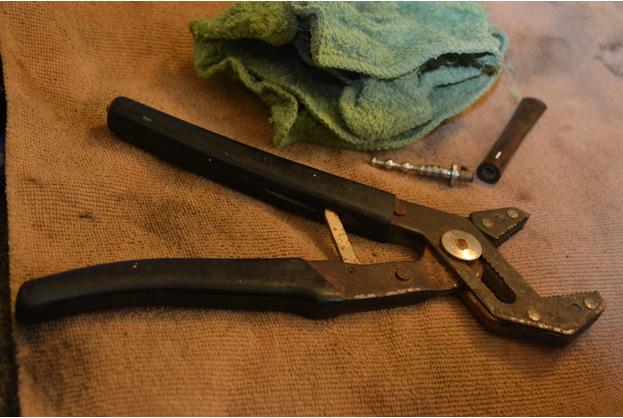 One lesson I did manage to learn from my dad in his countless frustrated endeavors to teach me about mechanics was that if a part of a mechanism or machine would not come free using reasonable pressure, don’t force it. But, always believing that not all of his maxims were absolute, I suspected he meant it as a guideline that was not immutable under controlled conditions I might someday, by some miracle, learn to recognize. Therefore, I found a small wash rag and a pump plier that I feared might be overkill, but it was all I owned that had not been stolen by previous apartment owners. I also possess a wicked sense of adventure at moments like these. Adjusting the rivet to match the job, I then wrapped the small towel around the base of the tenon/stinger by the flange and loosely clamped the end of the plier over the tenon. As I applied pressure, I could feel the two sides of the mouth turn and clamp firmly down on the rag-covered metal. Gripping the bit in one hand, I turned the plier with my other and immediately felt it begin to move. Slowly, it came free and undamaged.