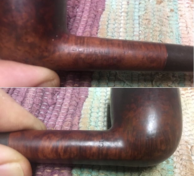 I took photos of the sides of the shank to show the stamping. The stamping is faint but readable in the photos below and is as noted above – on the left side it reads Schoenleber Hand Made and on the right side it is stamped with the number 4 at the shank/bowl junction. The stem has a coral dot on the top of the taper.