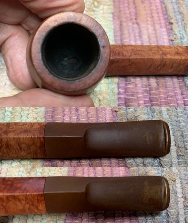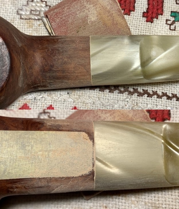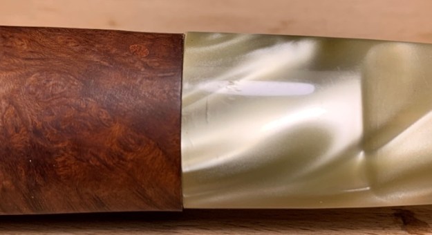 The acrylic stem is attractive, but I’m guessing that it’s a replacement stem. My first observation looked like the stem simply didn’t fit with a wobble and gaps showing between the shank and stem facings. When I removed the stem the acrylic tenon was stuck in the mortise and not attached to the tenon. It didn’t take much to dislodge the rogue tenon but after inserting it into the tenon and trying the fit again, the wobble and looseness is evident and if I’m able to reattach the acrylic tenon and keep the stem facing flush with the shank facing before the CA glue sets, it should do well.