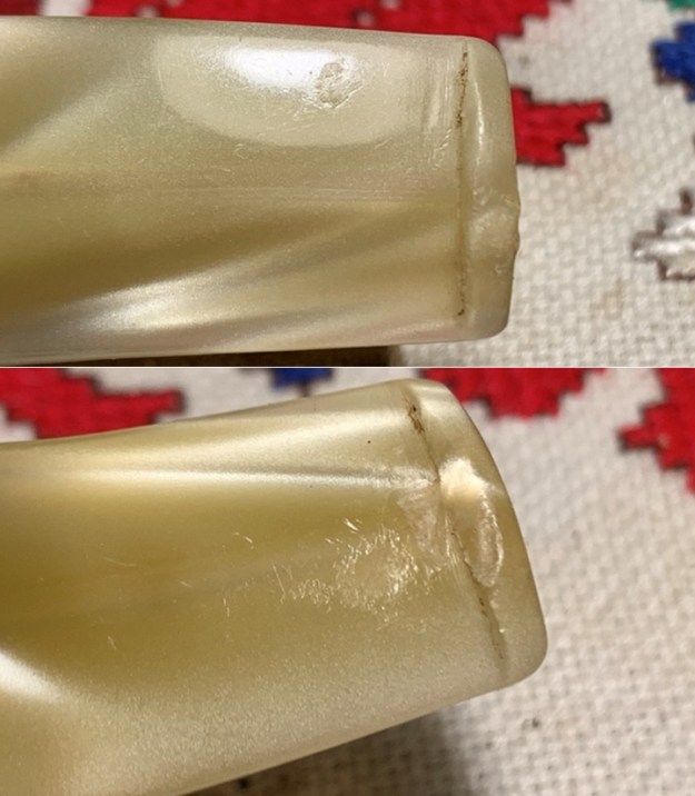 I decide to move forward with working on the acrylic stems button. The top button lip has been compressed on the left side and the lower lip has also been chewed. The tooth compressions on both upper and lower sides need filling.