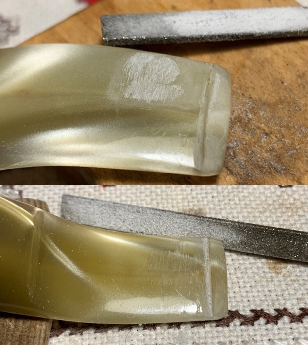 I next use a flat needle file to file the CA glue patches over the tooth compressions down to the stem surface on both the upper and lower bit. I file and shape the button repair as well.
