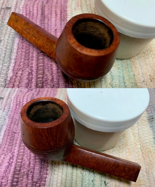 After working on the rim and stummel surface, I take the stummel to the kitchen sink using hot water and clean the internals using shank brushes and anti-oil dish soap liquid. After thoroughly rinsing the stummel with water, back on the worktable a picture records the present cleaning state.