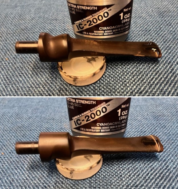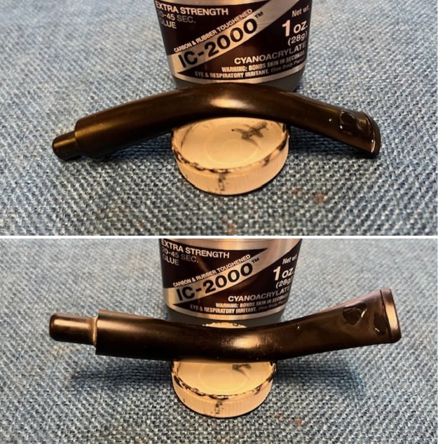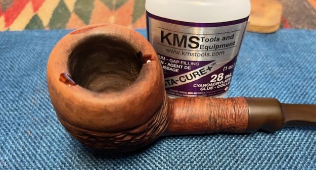 I started my work on the pipe by trying to reduce the darkening and damage to the inner edge of the rim with a folded piece of 220 grit sandpaper. I worked it over until the rim edge was clean and smooth. There was also a deep scratch on the right side of the bowl toward the back top that I filled in with clear CA glue and sanded it smooth with 220 grit sandpaper.