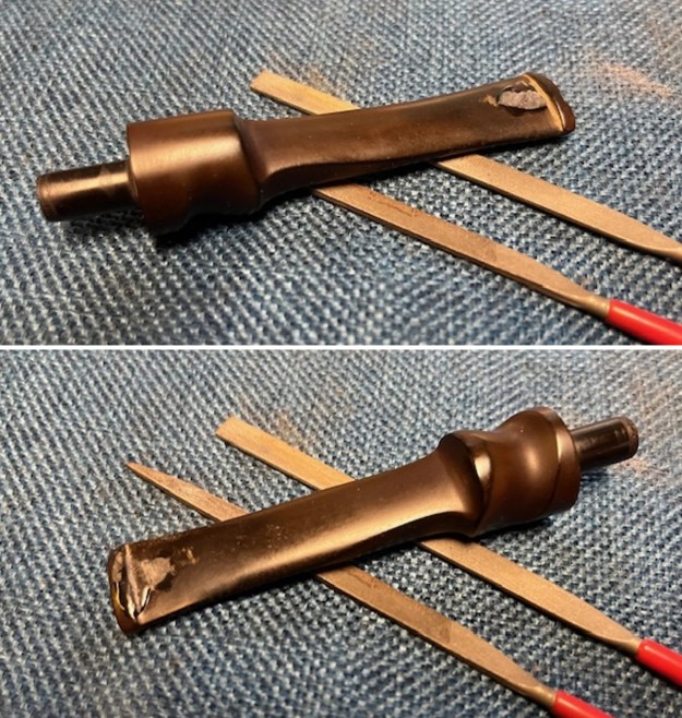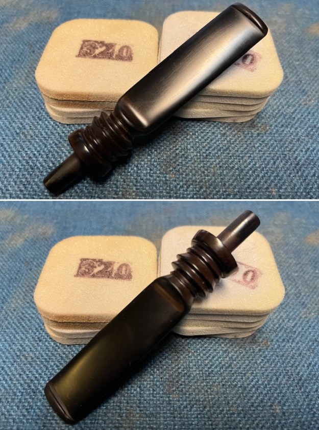 I set the bowl aside and turned my attention to the vulcanite stem. I sanded out what appeared to be wrinkles in the vulcanite on the underside at the bend with 220 grit sandpaper. I also smoothed out the chatter and roughness on the rest of the stem at the same time (I forgot to take photos of this part of the work). I sanded the stem with 320-3500 grit sanding pads to remove the tooth marks and chatter against the button edge. I wiped the stem down between pads with an Obsidian Oil cloth to remove the sanding debris from the stem.