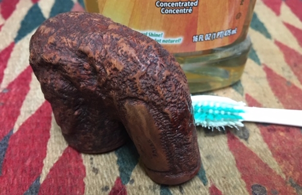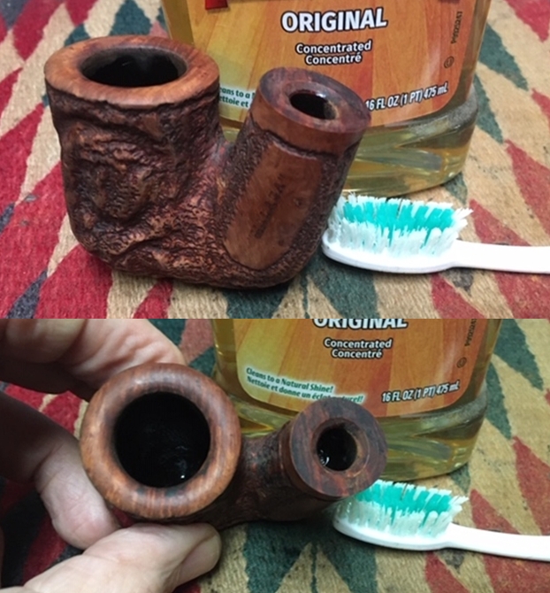 Jeff reamed the bowl with a PipNet pipe reamer and followed up with a Savinelli Fitsall pipe knife to remove the cake. He scrubbed out the mortise and the airway in the shank and the stem with alcohol, cotton swabs, shank brushes and pipe cleaners. He scrubbed the exterior of the bowl, rim, shank and stem with a tooth brush and Murphy’s Oil Soap to remove the oils and tars on the rim and the grime on the finish of the bowl. He rinsed it under running water. He dried it off with a soft cloth. He was able to remove the lava build up on the rim top and the flat surface of the rim top and the inner edge had some burn damage on the front and back side. The outer edge was rough and nicked. I took photos of the pipe to show its condition before I started my work on it. The stem also looked better.