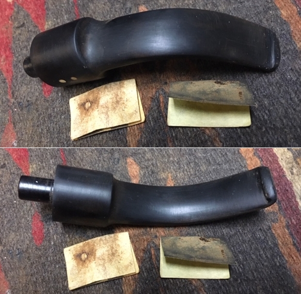 I took close up photos of the bowl and rim top as well as the stem. You can see the condition of the rim top and bowl in the first photo. Jeff was able to remove all of the tar and oils but you can now see the damage on the top and the edges of the bowl. The top of the rim is rough and the outer edges are chipped and rough. There is some darkening on the inner edge but the bowl is still round. The stem had tooth marks and chatter on both sides near and on the button surface on both sides.
