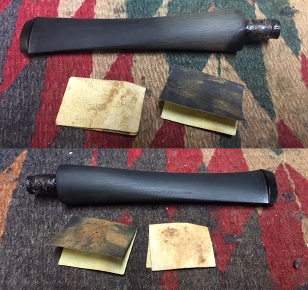 I set aside the bowl and turned my attention to the stem. I “painted” the surface of the stem with the flame of a Bic lighter to lift them as much as possible. I did the lifting of the marks at the same time I heated the stem to bend it. I filled in the remaining tooth dents and marks with rubberized Black CA Glue and set it aside for the repairs to cure. Once they cured I flattened them with small files. I cleaned up the repaired areas with 220 sandpaper to blend the repairs into the surface of the stem.