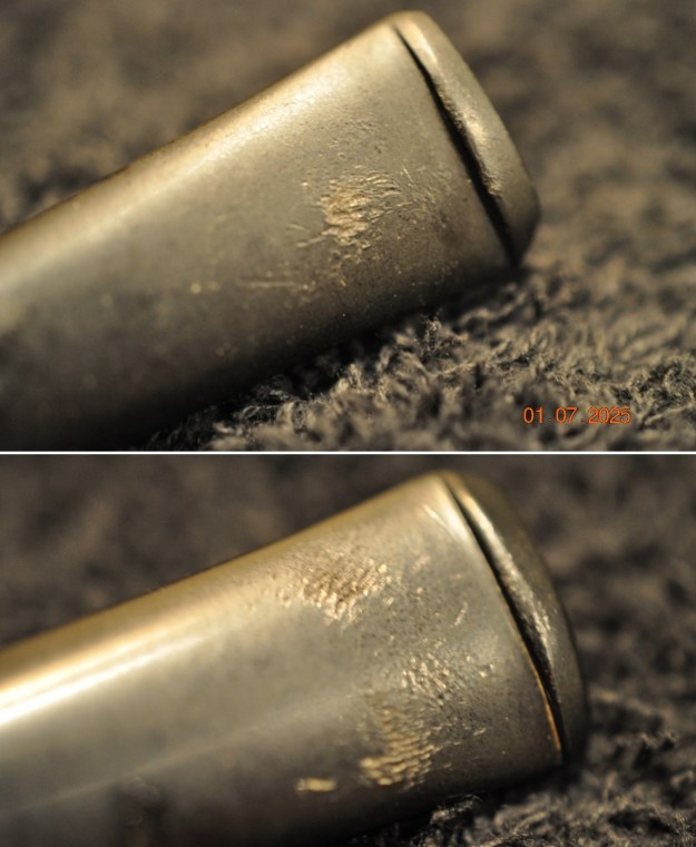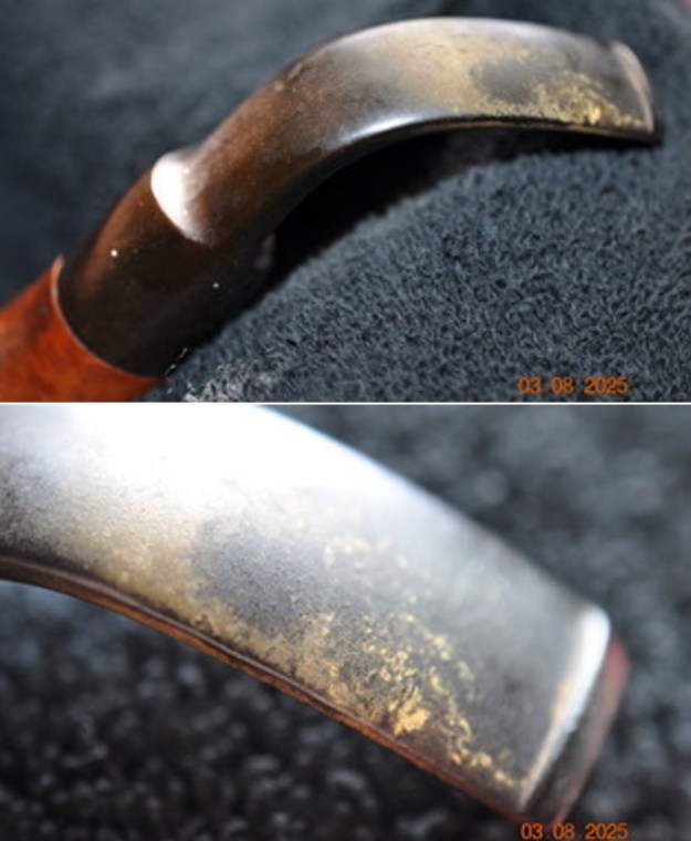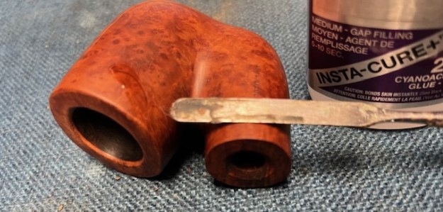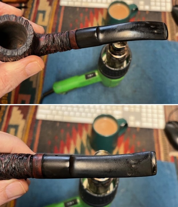 I set aside the bowl and turned my attention to the stem. I “painted” the surface of the stem with the flame of a Bic lighter to lift them as much as possible. I did the lifting of the marks at the same time I heated the stem to bend it. I filled in the remaining tooth dents and marks with rubberized Black CA Glue and set it aside for the repairs to cure. Once they cured I flattened them with small files. I cleaned up the repaired areas with 220 sandpaper to blend the repairs into the surface of the stem.