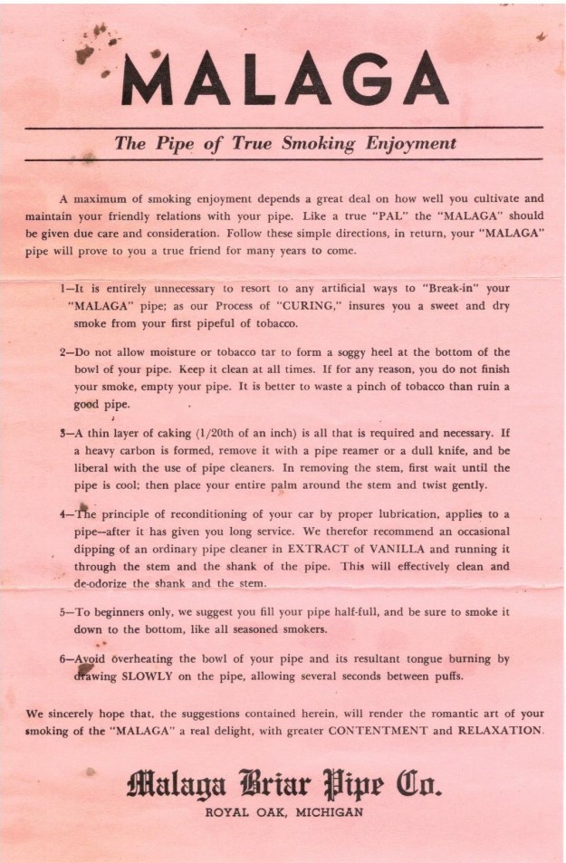 I am including the link to a blog that I wrote that gives some of the history of the Malaga brand and the Malaga Pipe Shop in Royal Oak, Michigan in the USA. I have written an earlier blog to give a little history of the Malaga Brand and the pipemaker, George Khoubesser. Here is the link – https://rebornpipes.com/tag/malaga-pipes/.That blog also includes links to a catalogue and the history of the pipemaker George Khoubesser. Follow the link to get a feel for the brand and the pipemaker.