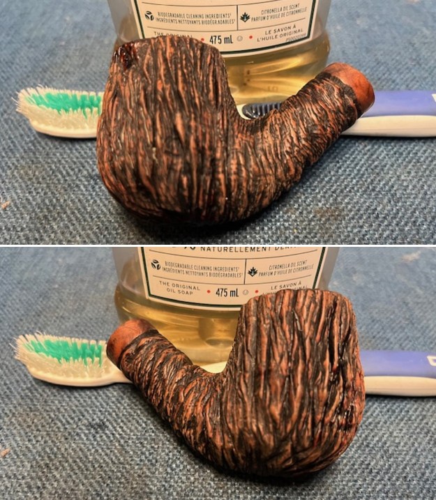 Jeff had cleaned up the pipe with his usual penchant for thoroughness. He reamed the pipe with a PipNet pipe reamer and removed the rest of it with a Savinelli Fitsall Pipe Knife. He scrubbed the bowl with undiluted Murphy’s Oil Soap with a tooth brush. He rinsed it under running warm water to remove the soap and grime. He cleaned out the inside of the shank and the airway in the stem with alcohol, cotton swabs, shank brushes and pipe cleaners. He soaked the stem in Briarvilles Pipe Stem Deoxidizer and rinsed it off with warm water. I took photos of the pipe once I received it.