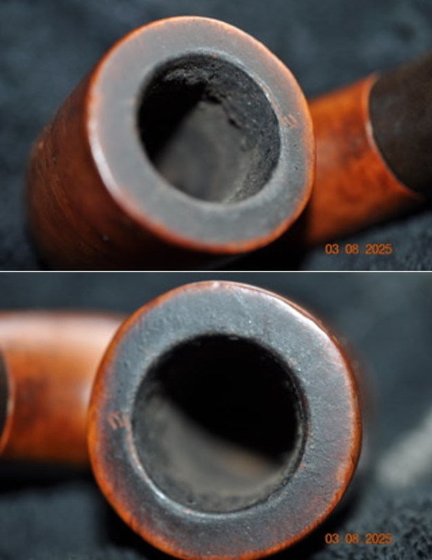 The rim top cleaned up really well. The rim top and outer edge of the bowl show some darkening over most of the surface. There is damage to the inner edge of the bowl and bowl is out of round. The stem surface looked very good with tooth marks and chatter on the top side and the underside near the button.