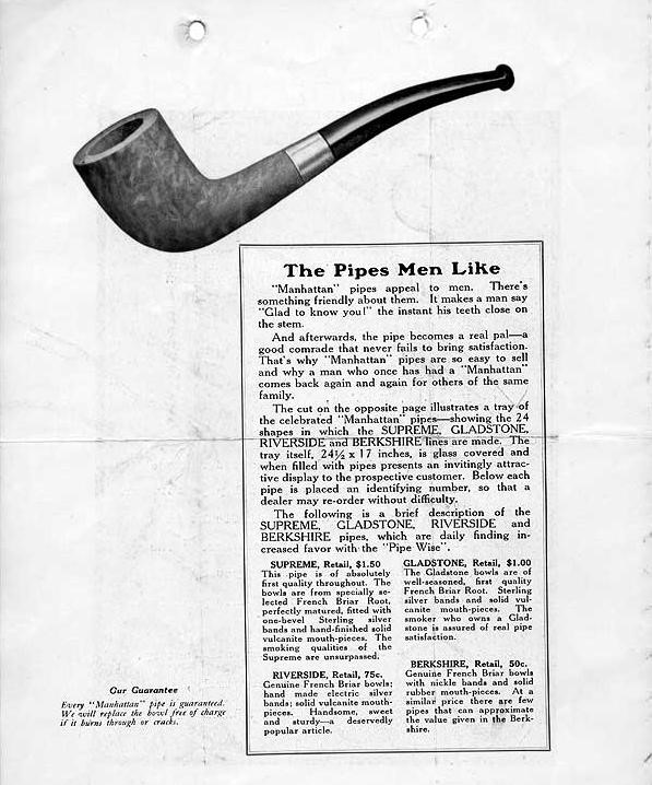 Manhattan Briar Pipe Co. had started operations in 1905 in Jersey City, New Jersey, having taken on a lease for a ten year period in 1905, and maintained a factory at Marion, New Jersey, where the pipes were made. By 1913, former American Tobacco pipe department chair John Glossinger was the president of Manhattan Briar Pipe Company, and began a significant advertising push for high grade pipes, using the slogan “Don’t spoil good tobacco by using a poor pipe”. It appears from cases having appeared on the estate market that Manhattan also sold meerschaum pipes, most likely rebranded articles originally made by European craftsmen.