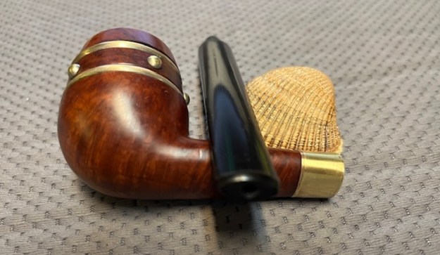 I touched up the gold stamp on the top of the shank with Rub’n Buff Antique Gold. I worked it into the stamping with a tooth pick and buffed it off with a soft cloth. It was very readable and looked good with the brass band and brass rings and studs on the bowl.