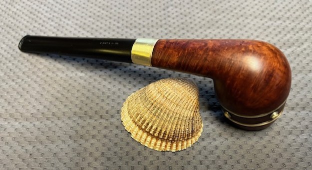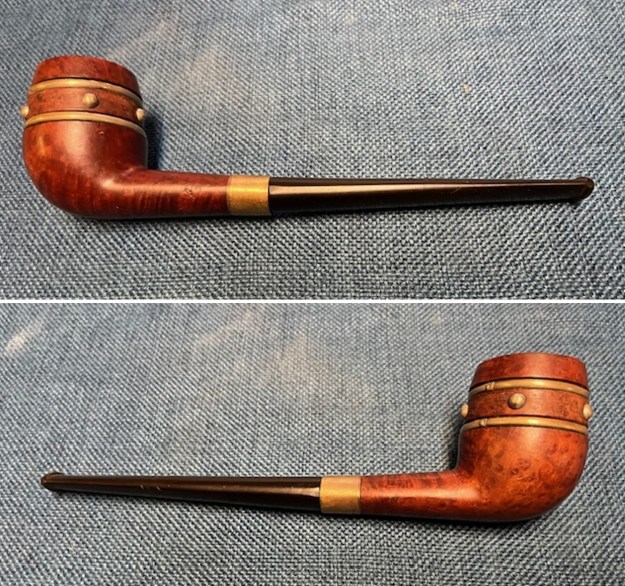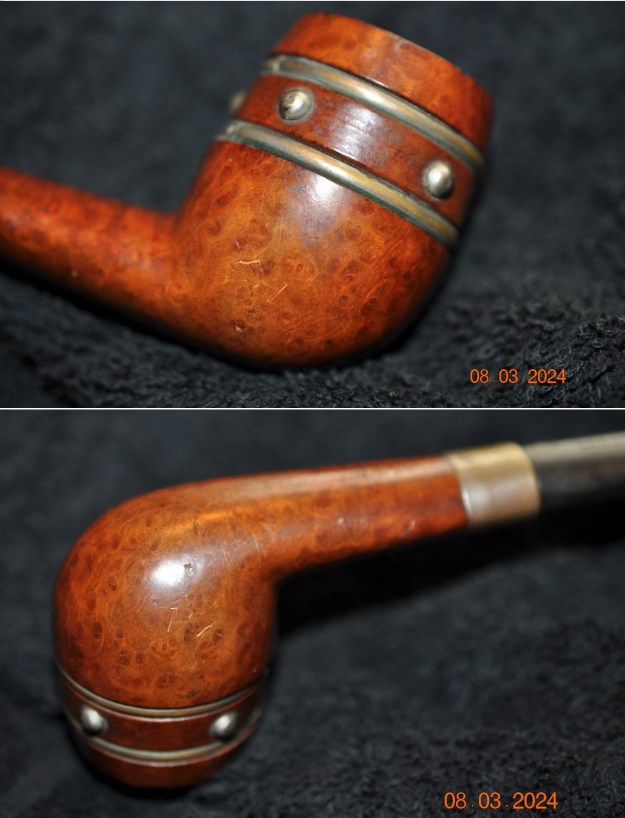 I touched up the gold stamp on the top of the shank with Rub’n Buff Antique Gold. I worked it into the stamping with a tooth pick and buffed it off with a soft cloth. It was very readable and looked good with the brass band and brass rings and studs on the bowl.