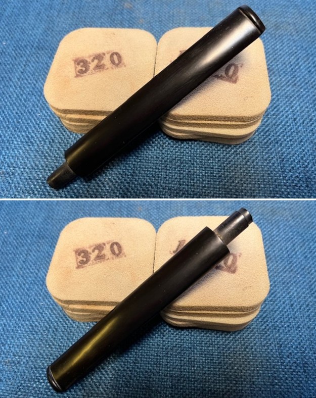I set aside the bowl and turned my attention to the stem issues. I sanded it with a folded piece of 220 grit sandpaper to begin the process of blending the chatter and marks into the stem surface. On the underside I found a piece of metal embedded in the rubber confirming an early date as mentioned above.