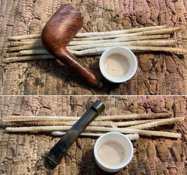 Now it was time to clean out the inside of the shank and stem. I used isopropyl alcohol, cotton swabs and pipe cleaners to remove the tars and oils. The shank was clogged near the entry to the bowl. I used an unfolded paper clip to poke through the airway and then worked pipe cleaners through the airway until the draught in the pipe was open and clean. I cleaned the airway in the stem at the same time using the same supplies. Once finished it smelled clean and fresh.