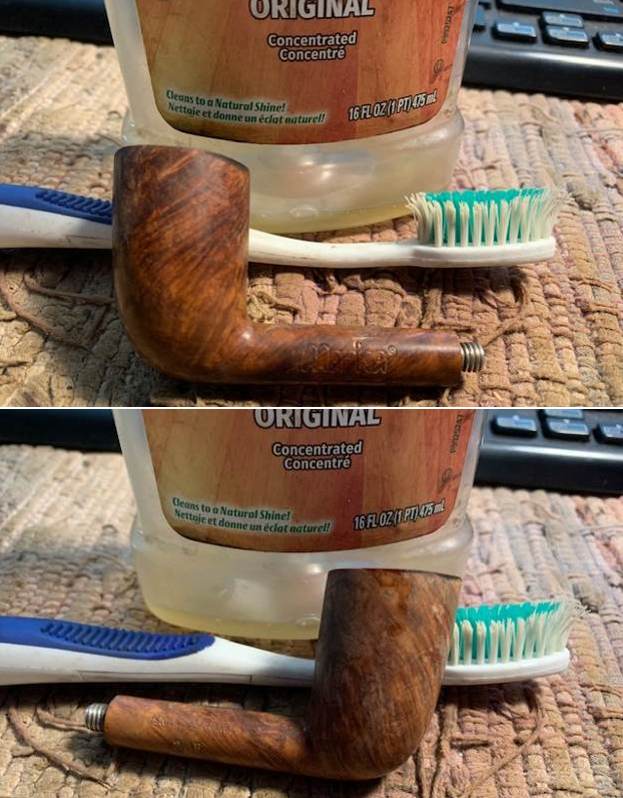 I scrubbed the exterior of the bowl and rim with undiluted Murphy’s Oil Soap and a tooth brush. I scrubbed the pipe with the brush to remove the grime and the tars on the rimtop. I rinsed the bowl with warm water to remove the soap and the grime. It began to look better. There was some burn damage on the outer edge of the rim toward the back of the bowl. It was not deep damage and would probably be easily removed.