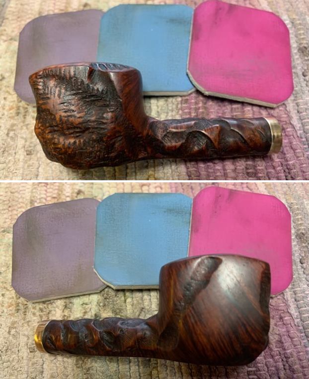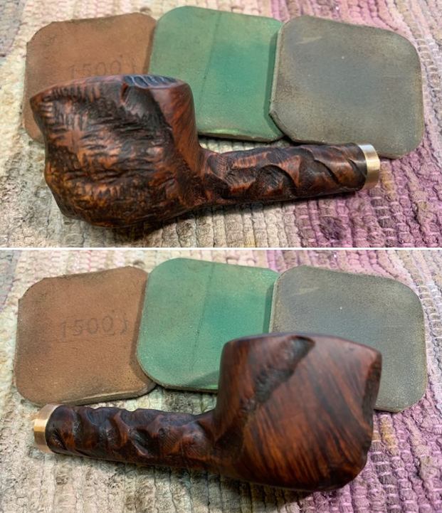 I polished the smooth portions of the briar with micromesh sanding pads – dry sanding it with 1500-12000 grit pads. I wiped the bowl down after each pad with a damp cloth. The finished bowl and shank look very good.