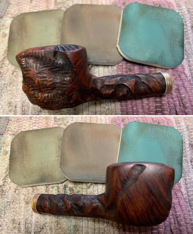 I worked some Before & After Restoration Balm into the surface of the briar with my finger tips and a shoe brush to get into the valleys and crevices of the rustication. The product is amazing and works to clean, enliven and protect the briar. I let it sit on the briar for 10 or more minutes and then buff it off with a soft cloth. It really makes the briar come alive and look quite rich.