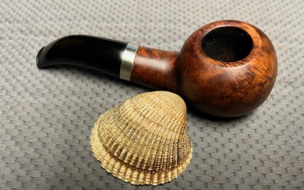 I found a thick vulcanite taper stem in my can of stems that would work with some adjustments. The tenon would need to be reduced in diameter and the diameter of the shank end would also need to be reduced. The size and shape of the stem were perfect to start with.