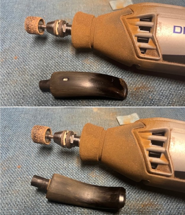 I used the Dremel and sanding drum to reduce the diameter of the stem as much as I safely could do and then cleaned it up with 220 grit sandpaper to smooth out and shape the stem.