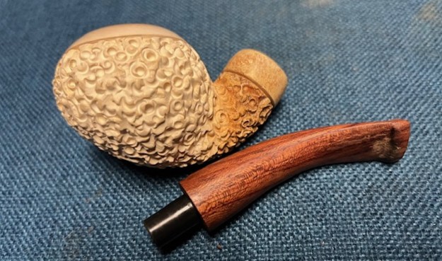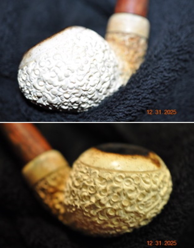 Later, when the pipe unexpectedly arrived at my home with El, I thought CC wanted me to take a closer look to help value it. However, El corrected me making sure I understood that her mom and dad wanted it to be mine. Oh my…. My task now is renewing this treasured Swan Neck Meerschaum, a gift from treasured friends. Realization that it was intended as a gift for me immediately resulted in doing a smiling selfie with El and Swan Neck Meerschaum on display and sending it to Svetly and CC with many thanks!