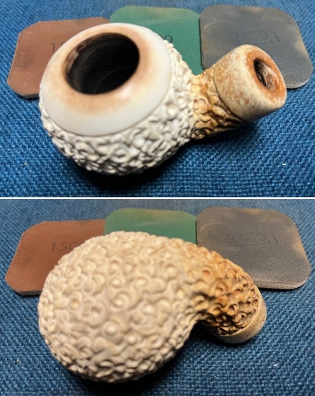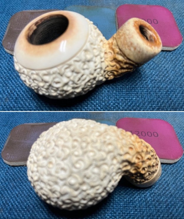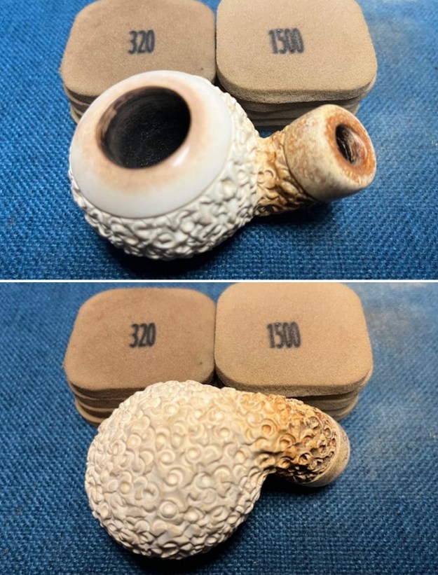 The rim is caked with lava flow and grime. To break up the crusted buildup, I give the stummel a soft topping using medium and light grade sanding sponges. The purpose is not to remove Meerschaum but simply to clean the rim.