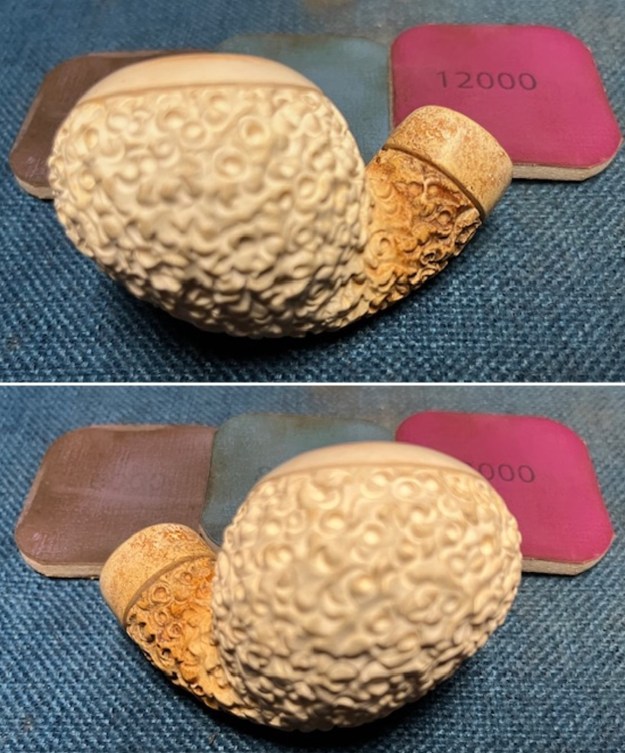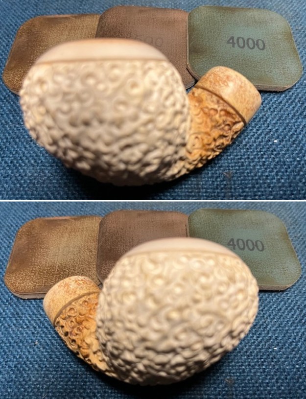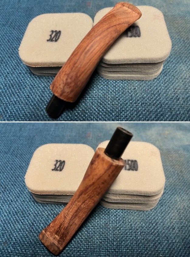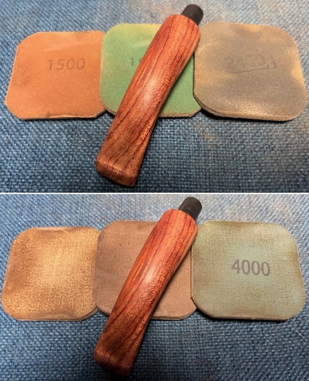 Next, the full regimen of micromesh pads are applied starting with wet sanding with pads 1500 to 2400. This is followed with dry sanding with pads 3200 to 4000 and 6000 to 12000. Between each set of 3 pads, Obsidian Oil is lightly applied to the stem. I’m very pleased with the repairs on the stem. They are all essentially invisible, including the break!