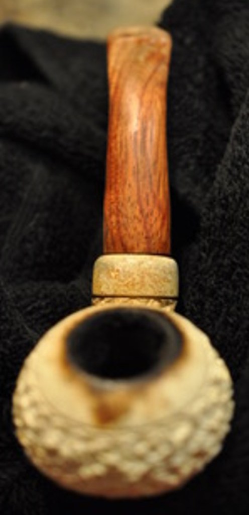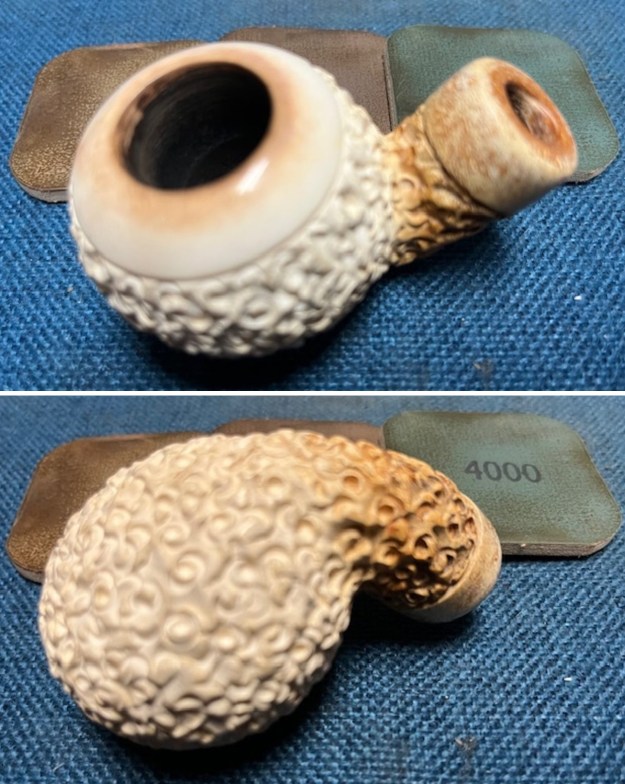The rim has a heavy cake of lava flow covering it and the chamber is also showing a moderately thick cake. I’ll clean the carbon cake to liberate the Meerschaum underneath. Meerschaum pipes need no cake protection as do briar pipes. This is one of the reasons Meerschaum pipes are unique – one can put them into service repeatedly without resting the pipe. Lock, load, and go again!