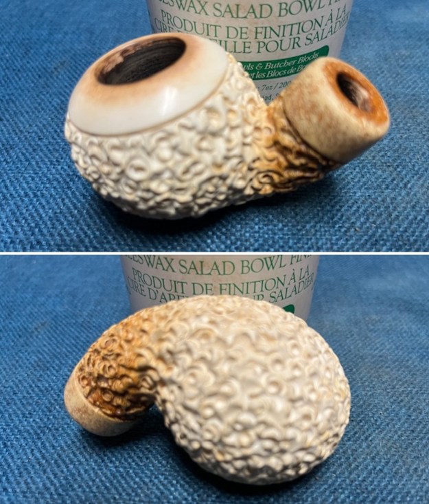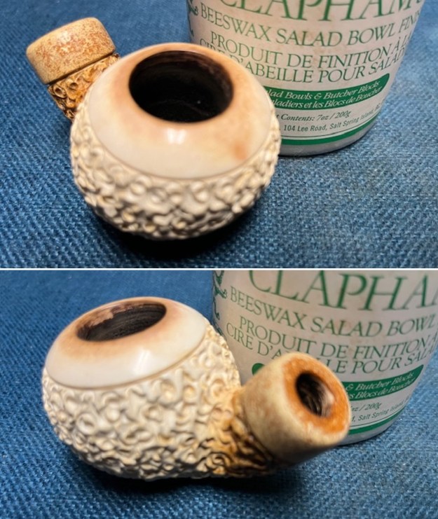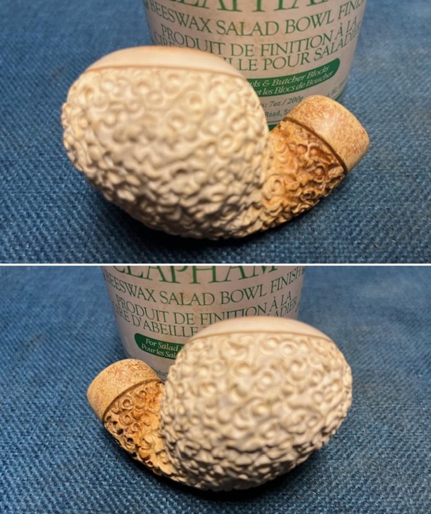 Next to clean the external surface, undiluted Murphy’s Oil Soap works well. Using a cotton pad, I scrub the external Meer surface. The soap will not remove patina. This is a unique surface for a Meerschaum. It’s not like anything I’ve seen before.
