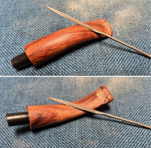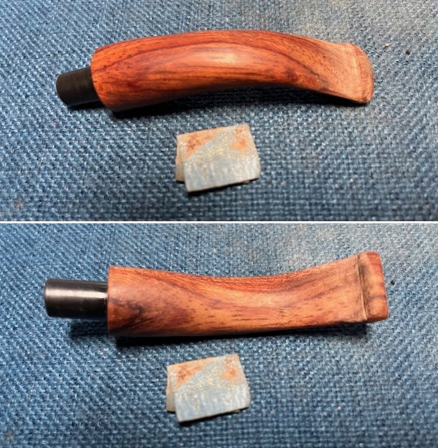 Well, it all was going so well until it wasn’t. Disaster. It has taken me some time to come back to this project because of what happened next. I was considering how I might provide a better connection between the stem and stummel and I was testing the fit of a push/pull acrylic tenon’s size with the amber stem and the amber broke…. There is no way to describe the shock followed by the deep sense of unbelief and then self-incrimination of asking myself, why I did what I did to cause the break? I had to walk away from from this project – I couldn’t look at the pieces. Gradually, this micro tragedy found its way into the broader context of life’s larger problems and tragedies and perspective slowly regains a footing. I was then able to return to the ‘scene of the crime’ and take these pictures and continue from here.