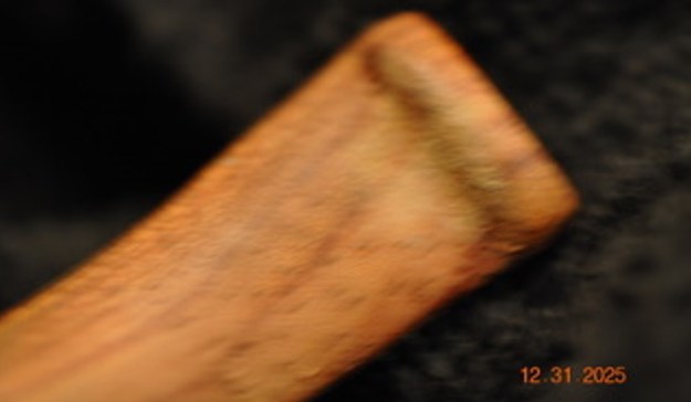 At this point, my thinking has switched to confirming the possibility that it is indeed amber. The nugget that convinced me that the stem was amber was discovered as I read more about testing FOR amber. I discovered that the heat test with the thumb ALSO produces an odor when done on genuine amber, but of a very specific odor – a pine scent. With my first hat testing try, I was simply trying to dial in an odor, period. I repeated the test and the scent of this stem is definitely pine not chemical formaldehyde!