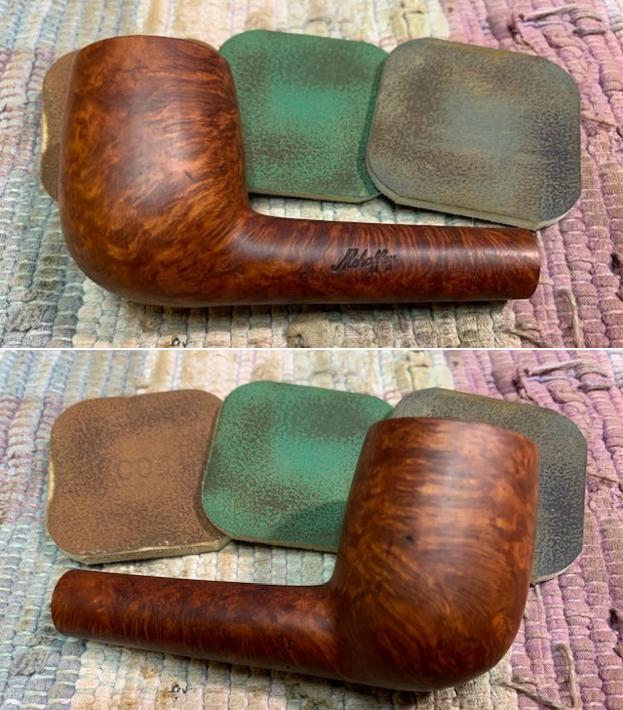 Time to unwrap the stained Mehaffey Cutty and see the results. I mount a felt buffing wheel on the Dremel and set the speed at the slowest. After purging the wheel with the Dremel’s metal tightening wrench, using Tripoli compound, I apply the more abrasive compound by moving the wheel in a circular motion over the surface removing the fired crust. After completing application of Tripoli, I wet a cotton pad with isopropyl 95% and wipe the surface down to blend the dye evenly over the briar. I then mount the cotton cloth buffing wheel on the Dremel and add speed up to 2, with the fastest being 5. I then apply a lesser abrasive compound, Blue Diamond, in the same fashion as the Tripoli compound. When I complete applying Blue Diamond to the stummel, I reunite the stem and stummel and use Blue Diamond on the tapered stem. I complete the application of compounds by hand buffing stem and stummel with a soft felt cloth to remove the compound dust from the surface in preparation for applying carnauba wax. The pictures show the progress – looking very, very nice!
