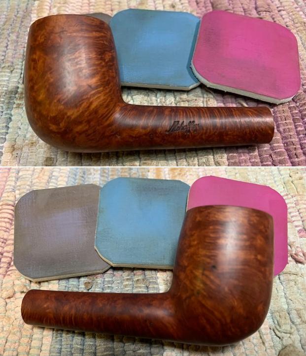While I wait for Steve’s response, I’ll focus now on the rim repair. I begin by using 240 grit sanding paper on a chopping board to create my topping board. Before putting paper on the board, I invert the stummel on the board and eyeball it free standing. I want to make sure that I top it keeping the angle of the rim parallel to the board. Damaged, scorched wood tends to be softer. I have learned by unfortunate experience that it’s easy to start angling into the softer wood and be left with an angled rim plane. Not pretty! As I free stand the inverted stummel, I discover there is a rock – the rim is already dipping. I determine by looking at which part of the rim is healthy, which part of the rim needs to guide the topping while not dipping into the worn area – softer part of the rim.