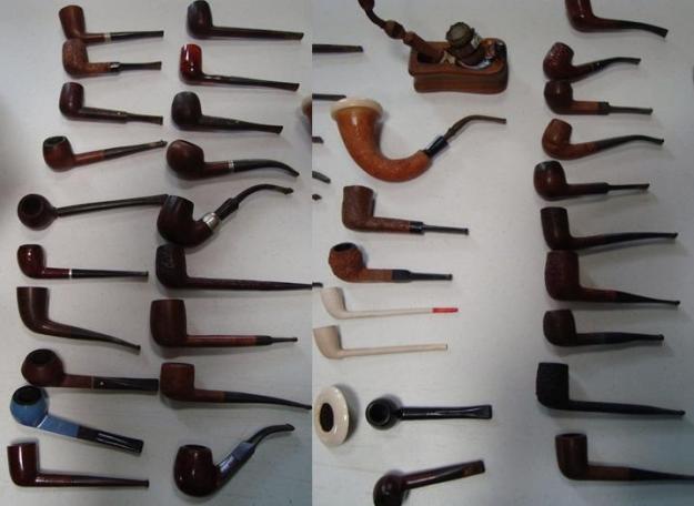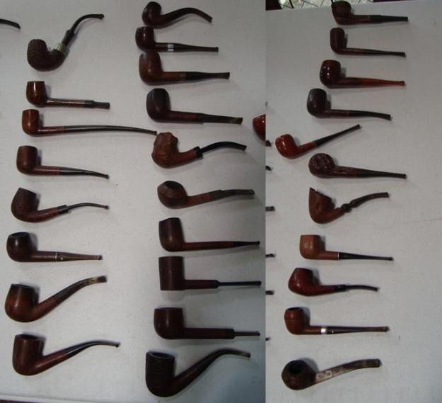 The first major acquisition was a Lot of 66 from eBay – the largest lot I’ve ever tackled! One tries to examine the pictures provided by the seller to assess the possibilities – looking for treasures lurking here and there among all the shapes and nomenclature, and I believe I did well. Some of the highlights of the Lot of 66 include a Gourd Calabash sculpted with a Meer bowl, Comoy’s Made in London England P510 – D billiard, Peterson’s System Standard K&P Republic 312, GBD Flame 1344 Made in France poker, Kaywoodie Super Grain 08 Dublin, Comoy’s Sunrise Volcano – H 16, Savinelli 4015 Dublin, Sculpted Imported Briar calabash, M.G.M. Rock Italy Briar 19 12 – 25 freehand, GBD International London Made London England 549 rustified rim bent bulldog, Butz Choquin Regate St. Claude France 1693 bulldog, Imperial Churchwarden Algerian Briar France, Butz Choquin Regate St.Claude France 1275 Slightly bent billiard, Kiko 343 Made in Tanganyika Meer lined, Peterson System Standard Republic 392, Abbott London Made 715 pocket pipe, Jarl Chieftan 15119 Made in Denmark billiard, Jarl 1545 Made in Denmark Dublin, Savinelli Capri Root Briar Italy 8004 rustified Canadian, Ben Wade Hand Model LONDON MADE, Savinelli Punto Oro 510ks Italy bulldog rustification, Peterson’s “Kildare” Made in the Republic of Ireland 83. There were a few clay pipes in the Lot which I was interested in seeing. Unfortunately, the seller didn’t do a very good job packing and these were broken! Here’s a bird’s eye view of the Lot of 66 I saw on eBay and now in Bulgaria (the pictures aren’t great but gives an idea what I had to work with):