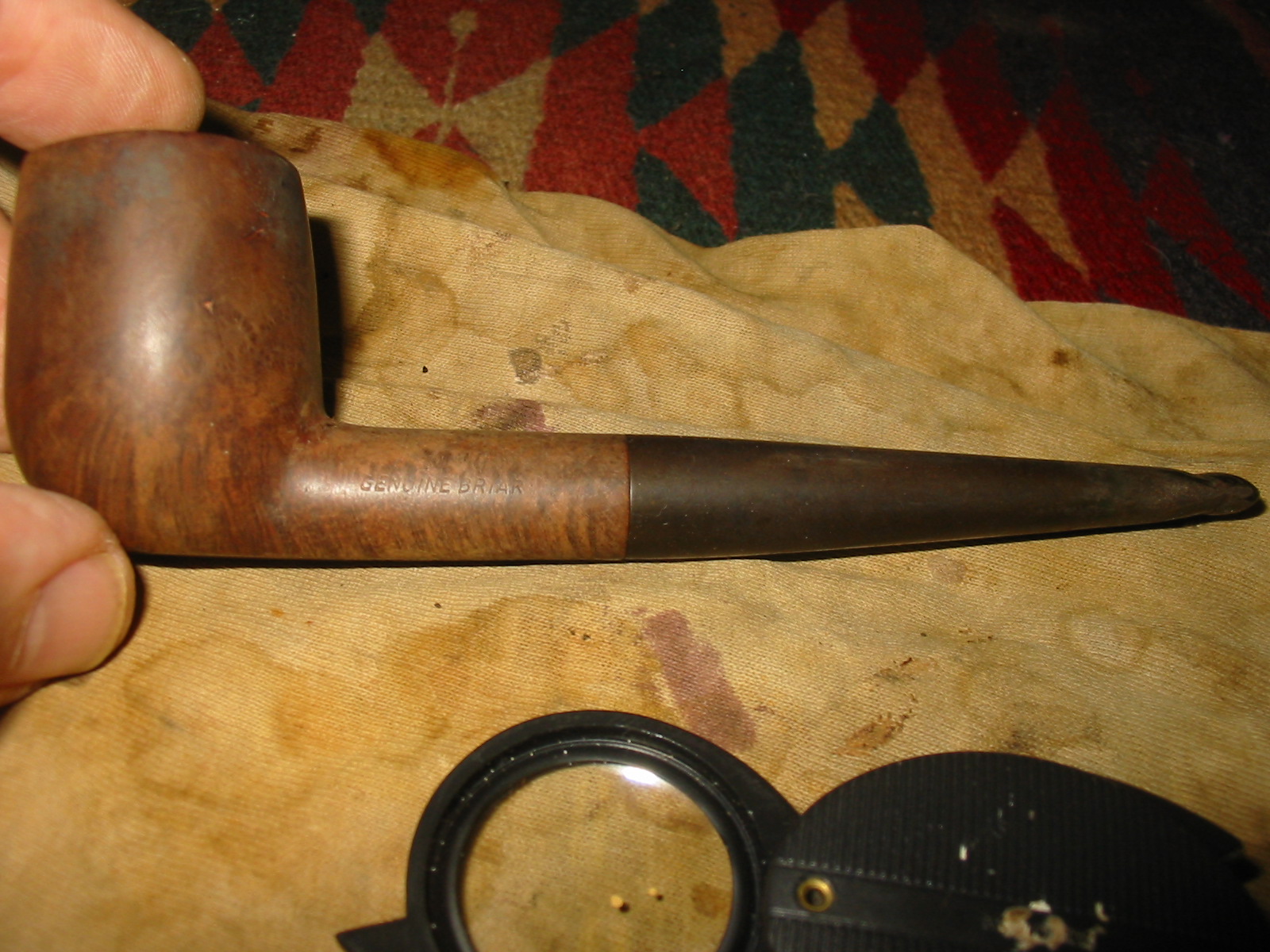 I have reworked a lot of stems over the years – from cutting them back in my early days and reshaping a button on the gnawed and damaged end to rebuilding a chewed button with charcoal and super glue. I have fit stem blanks on shanks to replace damaged and what were at that time in my assessment, irreparable stems. Today I am more conservative and lean towards rebuilding the stem as best as I can. That being said there are even challenges to that work. The pipe on my worktable now is a challenge to my current bent. It is an All Briar Rhodesian. I have only refurbished one other All Briar pipe in the past – a beautiful LHS Purex Bullmoose. It was in excellent condition other than being dirty and worn. I had heard nightmare tales of gnawed and chewed all briar stems and what a pain they are to work on. However, until this pipe came to my attention in a recent pipe hunt with Jeff I had never seen such a badly gnawed briar stem up close. Jeff took photos of the pipe’s condition before he cleaned it up. I have included those photos in the first part of this blog.