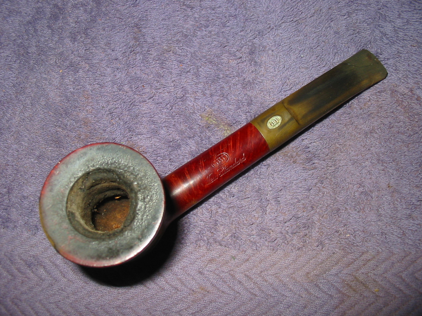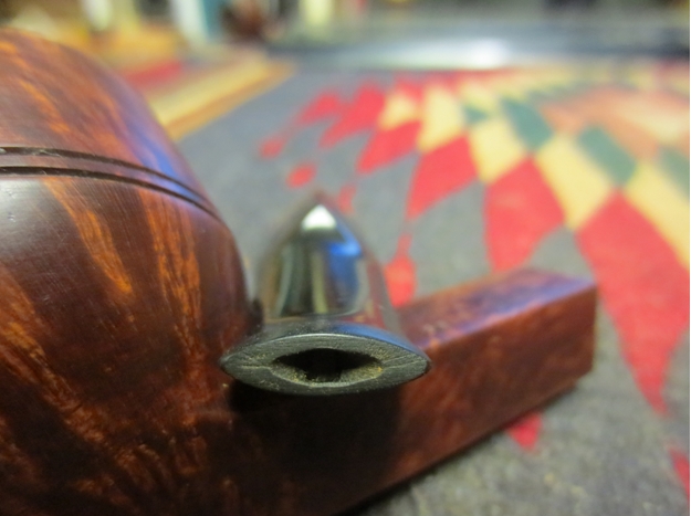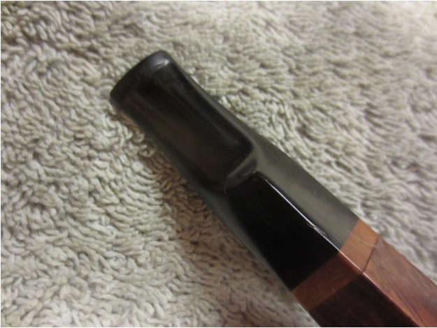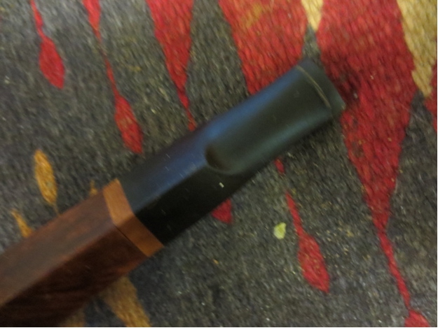 Jeff continued using his established process of thoroughly cleaning the pipes he sends to me. He did not vary in his procedure just because of the briar stem on this one. He reamed the bowl with a PipNet reamer and touched it up with a Savinelli Fitsall Pipe Knife. He scrubbed out the mortise and the airway in the shank and the stem with pipe cleaners, cotton swabs and alcohol and cleaned the exterior of the threaded tenon and four hole stinger with cotton swabs and alcohol. He scrubbed the exterior of the pipe with Murphy’s Oil Soap to remove the grime and grit on the bowl. Sadly it did not even touch the thick varnish coat on the bowl. He worked over the rim and removed the heavy lava overflow. He scrubbed it with a tooth brush and the oil soap until he removed the buildup. His cleaning of the top cut through the varnish coat on that part of the bowl. He cleaned up the gnawed end of the stem so that at least it would be clean when I began my work on it. I took photos of the pipe to show the condition it was in when it arrived in Vancouver.